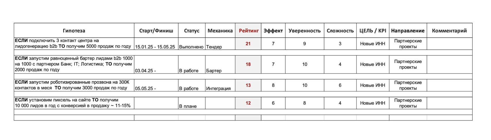Расфокусировка --> время и ресурсы будут расходованы неэффективно. Все гипотезы вносим в таблицу приоритизации с учетом: сложности реализации, эффекта и уверенности в отдаче (выполнения целей), фокусируемся на ТОП-3 гипотезах, набравших наивысший рейтинг.