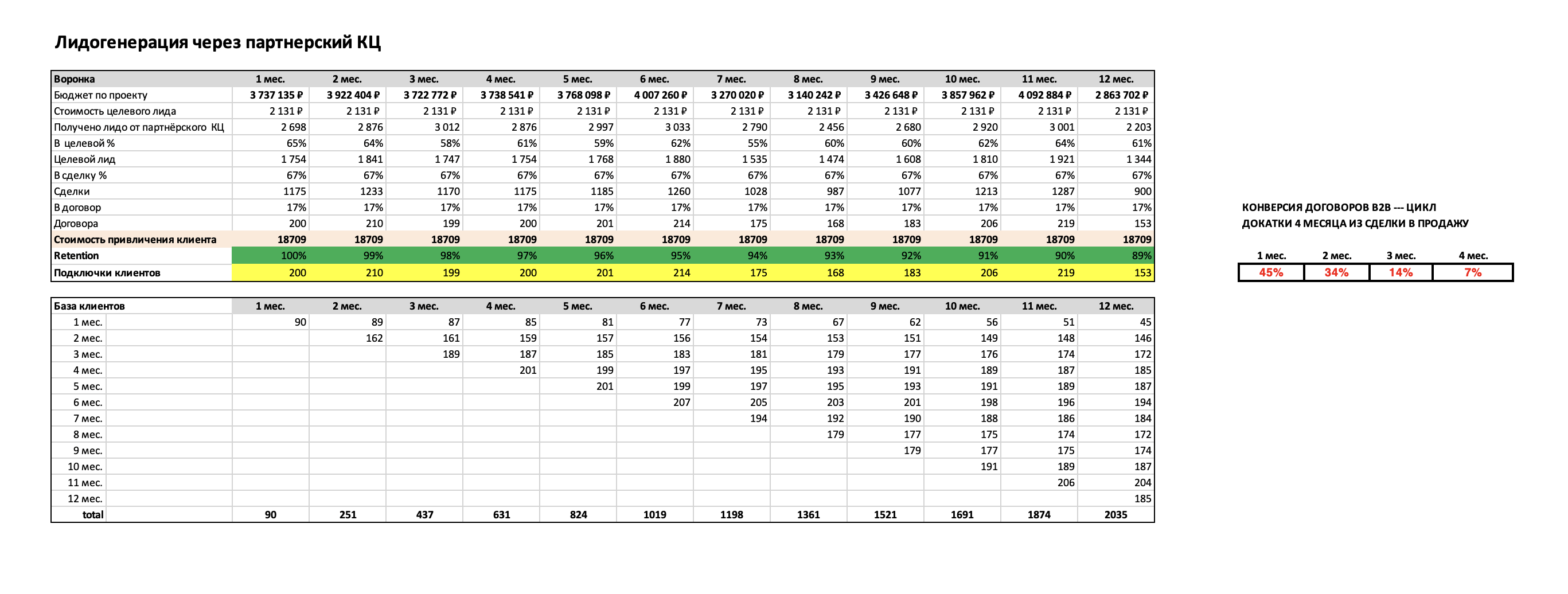 Используем простую таблицу: указываем затраты на проект, количество лидов, конверсию в договор с учетом циклов сделки.